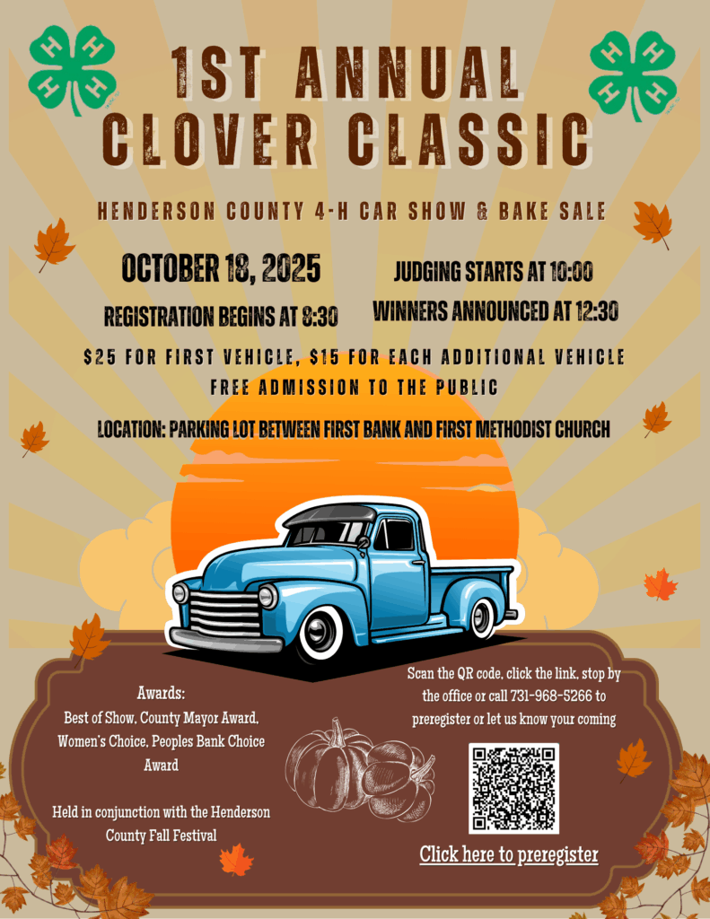 The Fall Festival will have a new friend this year! Henderson County 4-H is hosting the 1st Annual Clover Classic October 18, 2025, beside the courthouse. Get the cars shined up and drive on down to see us. We ask that you pre-register by scanning the QR code or by giving us a call at 731-968-5266. It is only $25 for the first car and $15 for each additional car/truck. Come celebrate the season with Henderson County! Attendance is completely FREE!